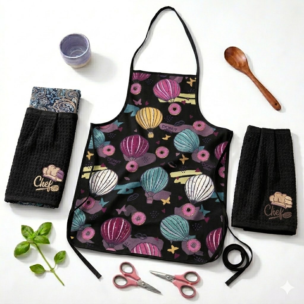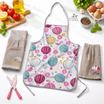 اجعلي وقت الطهي أكثر متعة ونظافة مع هذا الطقم الفريد والمصمم بعناية ليجمع بين الجانب العملي والمظهر العصري. يجود الوان حسب ذوقك ، مع رسومات “المناطيد” الملونة التي تضفي حيوية على إطلالتك في المطبخ.